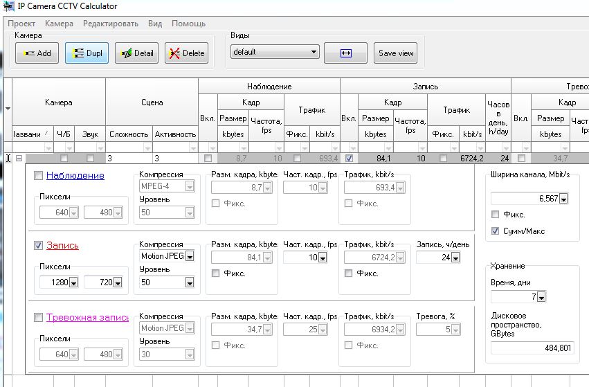 Для определения размера сжатого кадра удобно воспользоваться программами-калькуляторами, которые обычно можно взять на сайтах производителей камер. Для примера воспользуемся программой IP Camera CCTV Calculator Скриншот данной программы Вы видите в заголовке статьи